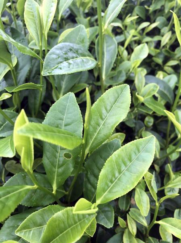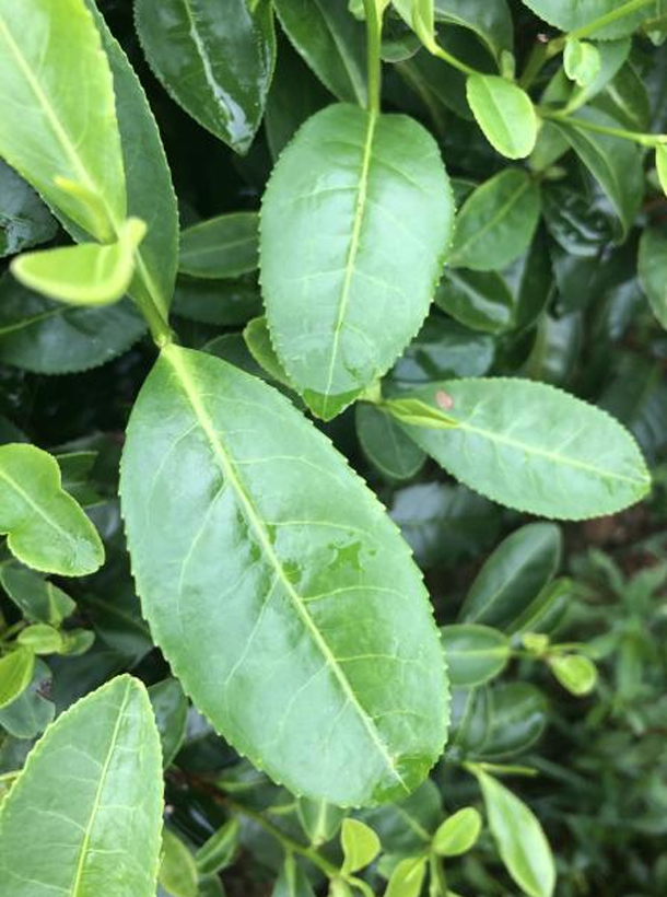【性狀特征】樹姿半開張,分枝較密。葉片呈半上斜狀著生,橢 服形,葉色綠,有光澤,葉面平展,葉身平,,葉緣平,葉尖漸尖,葉脈11對,鋸齒37對,葉質(zhì)較厚軟。花瓣白色、5瓣,尊片5枚,柱頭3裂。產(chǎn)量高,4~6齡茶園僅春季每667m'可產(chǎn)鮮葉1030kg。春季萌發(fā)早。2010年和2011年在長沙縣高橋鎮(zhèn)觀測,一芽二葉初展期分別為4月3日和3月27日,分別比福鼎大白茶早1天和6天。芽葉生育力和持嫩性強,淺綠色,茸毛較多,一芽二葉百芽重20.3g。