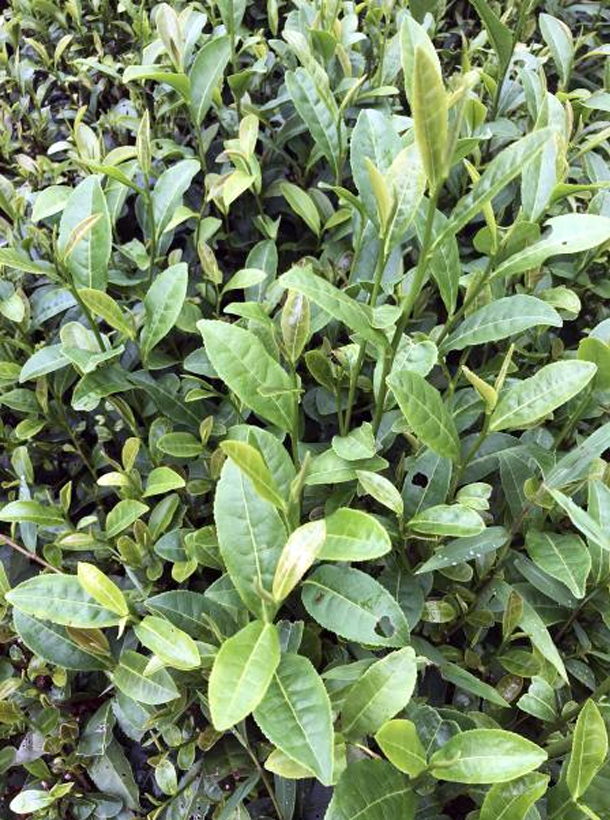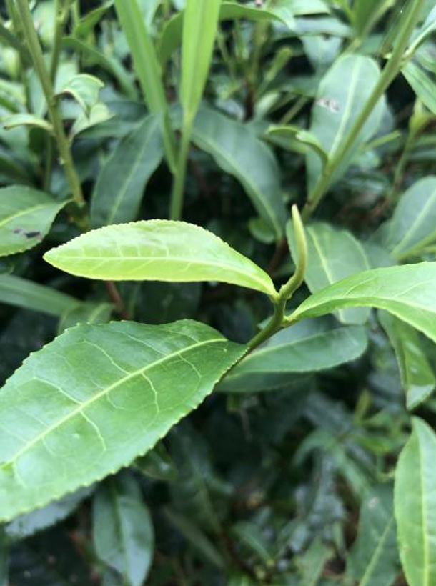 無性系。屬灌木型、中葉類、早生種。植株樹姿半開張,分枝密,葉姿上斜。葉片呈長(zhǎng)橢圓形,葉尖較鈍,葉面微隆起,葉色黃綠,富光澤,葉肉較薄,葉質(zhì)柔軟,側(cè)脈明顯,鋸齒較粗、整齊,葉緣微波,芽葉纖細(xì),色黃綠,嫩葉背卷。開花結(jié)實(shí)率一般。扦插成活率較高。發(fā)芽較早,春芽萌發(fā)期在3月中旬,一芽三葉盛期在4月中旬;發(fā)芽密度大,育芽力強(qiáng),芽葉纖細(xì),葉色黃綠,葉片薄,葉質(zhì)軟,茸毛多。一芽三葉百芽重29.7克。